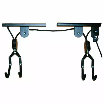 Gagnez de la place et rangez votre vélo en hauteur grâce au support de vélo pour plafond. Les deux crochets recouverts d’une gaine de protection en plastique noir viennent prendre le vélo au niveau du guidon et de la selle du vélo.
