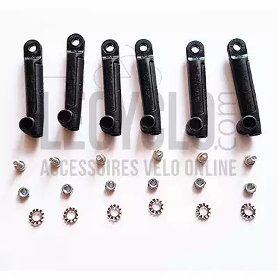 Le set comprend 6 unités d’adaptateur, chacune livrée avec une vis, une rondelle et un boulon. La vis et l’écrou fournis servent à sécuriser la tringle insérée dans l’adaptateur. La rondelle crantée se place, quant à elle, sur l’autre extrémité de l’adaptateur (qui vient se fixer sur les oeillets de fixation du vélo) pour permettre de bien ajuster l’angle.