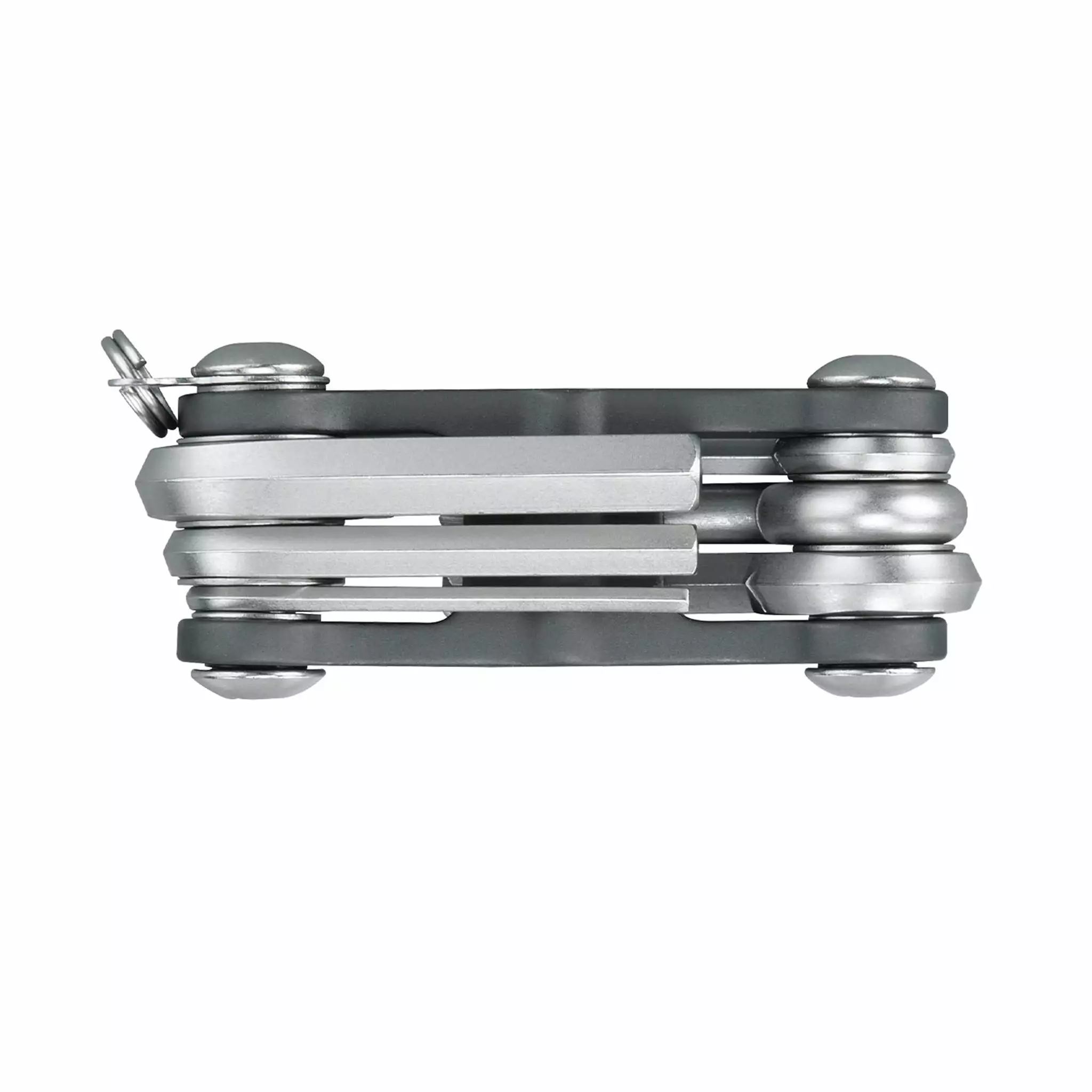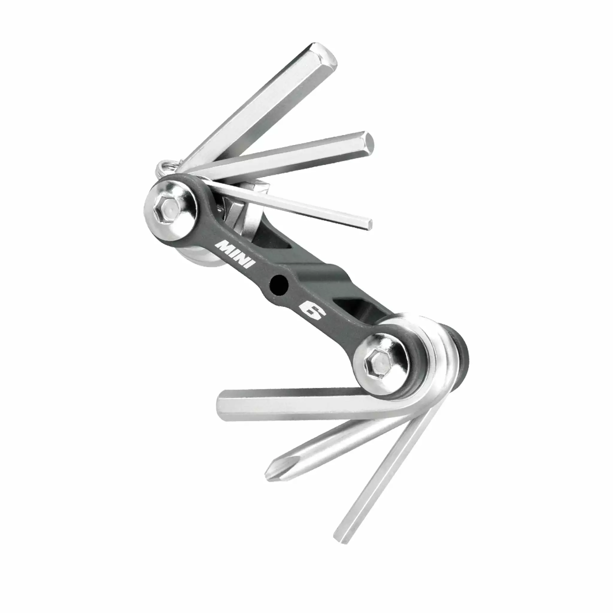 Le multi outil se compose d’un tournevis cruciforme #2 Phillips et de cinq clés Allen 2 / 3 / 4 / 5 / 6 mm. Les outils proposés dans le kit sont de qualité professionnelle avec des corps en acier chromé au vanadium. La structure est en aluminium extrudé, et tous les outils y sont solidaires. Un anneau permet d’accrocher le Mini 6 à un mousqueton, par exemple, pour le séparer des autres affaires et y avoir accès rapidement.