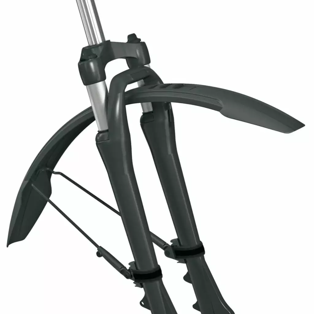 Le garde-boue avant se fixe Ă la fourche Ă l’aide de bandes velcros en caoutchouc. Les adaptateurs de cadre rendent le montage possible sur n’importe quelle fourche. Les entretoises de fixation Ă revĂŞtement noir assurent encore plus de maintien. Le garde-boue arrière se fixe aussi via des attaches en caoutchouc sur les haubans et le bas du tube de selle. La distance entre le pneu et la barre transversale du garde-boue doit ĂŞtre de 30 mm pour que le vĂ©lo soit compatible avec les garde-boues Veloflexx 65 et 55 de SKS. Consultez les instructions de montage des garde-boue SKS Veloflexx 65 et 55.